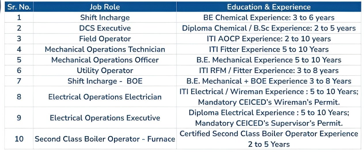 Positions :- Field Operator, DCS Executive, Shift Incharge & Others
