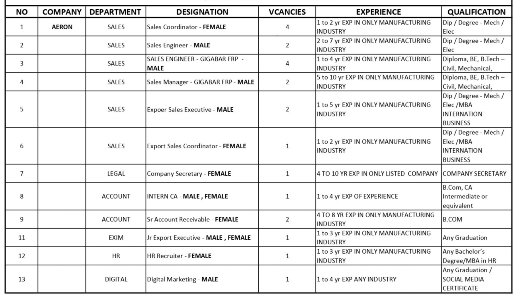 Aeron Composite Walk In Interview 2025 | Sales Engineer, Sales Coordinator & Others | Diploma/Degree | November 2025 |