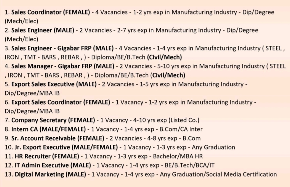 Positions :- Sales Engineer, Sales Manager, Sales Coordinator & Others