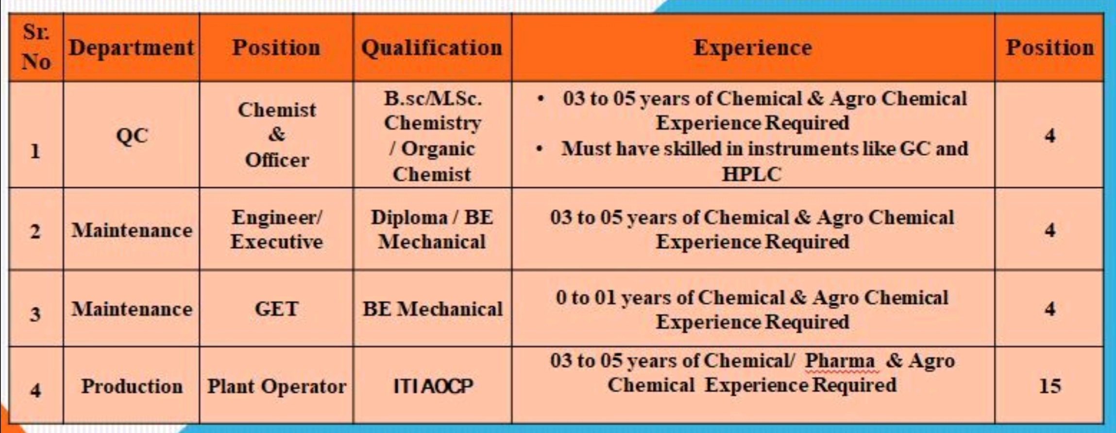Positions :- Plant Operator, Officer, Chemist & Others