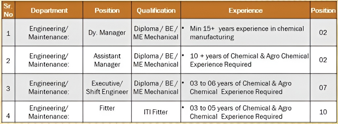 Positions :- Shift Engineer, Executive, Fitter & Others