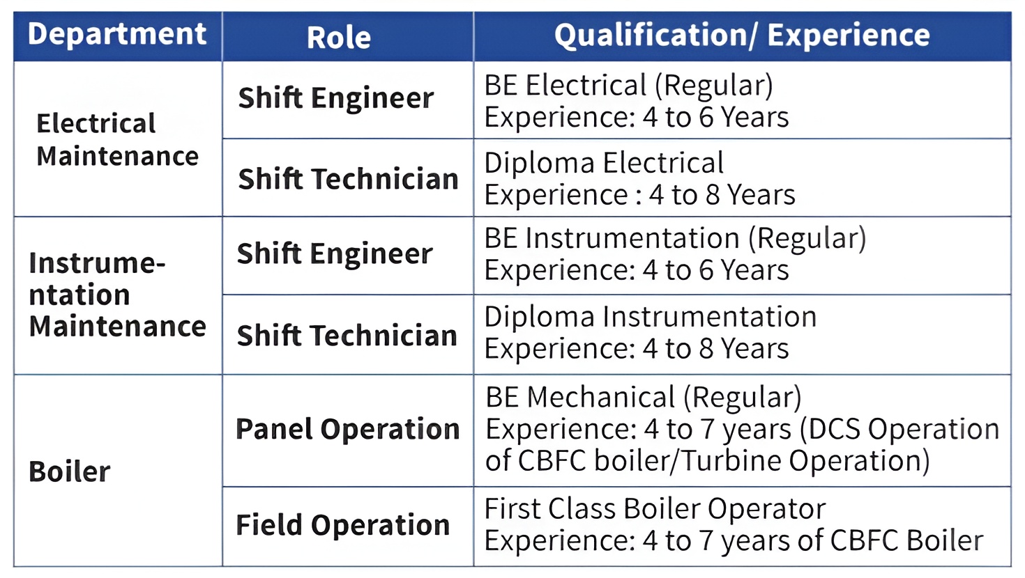 • Candidates must have Chemical/ Petrochemical Manufacturing experience with Continuous/Batch Manufacturing Process. CFBC boiler (Above 50TPH) experience with power plant will be additional advantage.