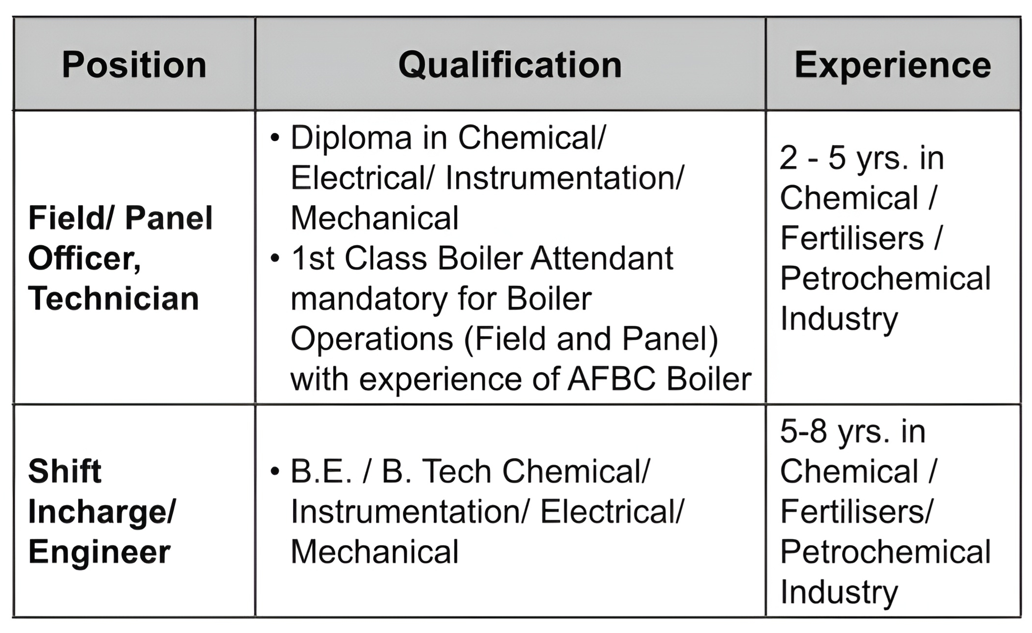 Positions :– Field/Panel Officer, Technician, Shift Incharge/Engineer