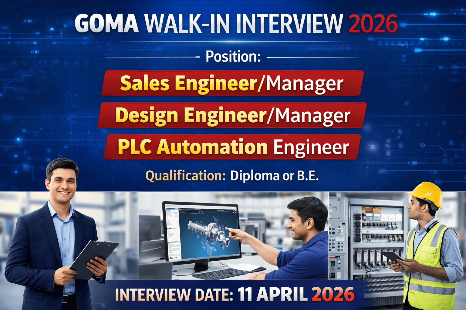 Goma Walk-in Interview 2026: Goma Group of Companies is hiring for Sales Engineer/Manager, Design Engineer/Manager, and PLC Automation Engineer posts in the Pump Division. Candidates with Diploma or B.E in Mechanical, Electrical, or Instrumentation Engineering with relevant experience can attend the walk-in interview. Candidates looking for jobs in Mumbai, Maharashtra can utilise this opportunity. Interested and eligible candidates can attend the Walk-in Interview on 11 April 2026. The detailed eligibility and selection process for Goma careers is explained below.