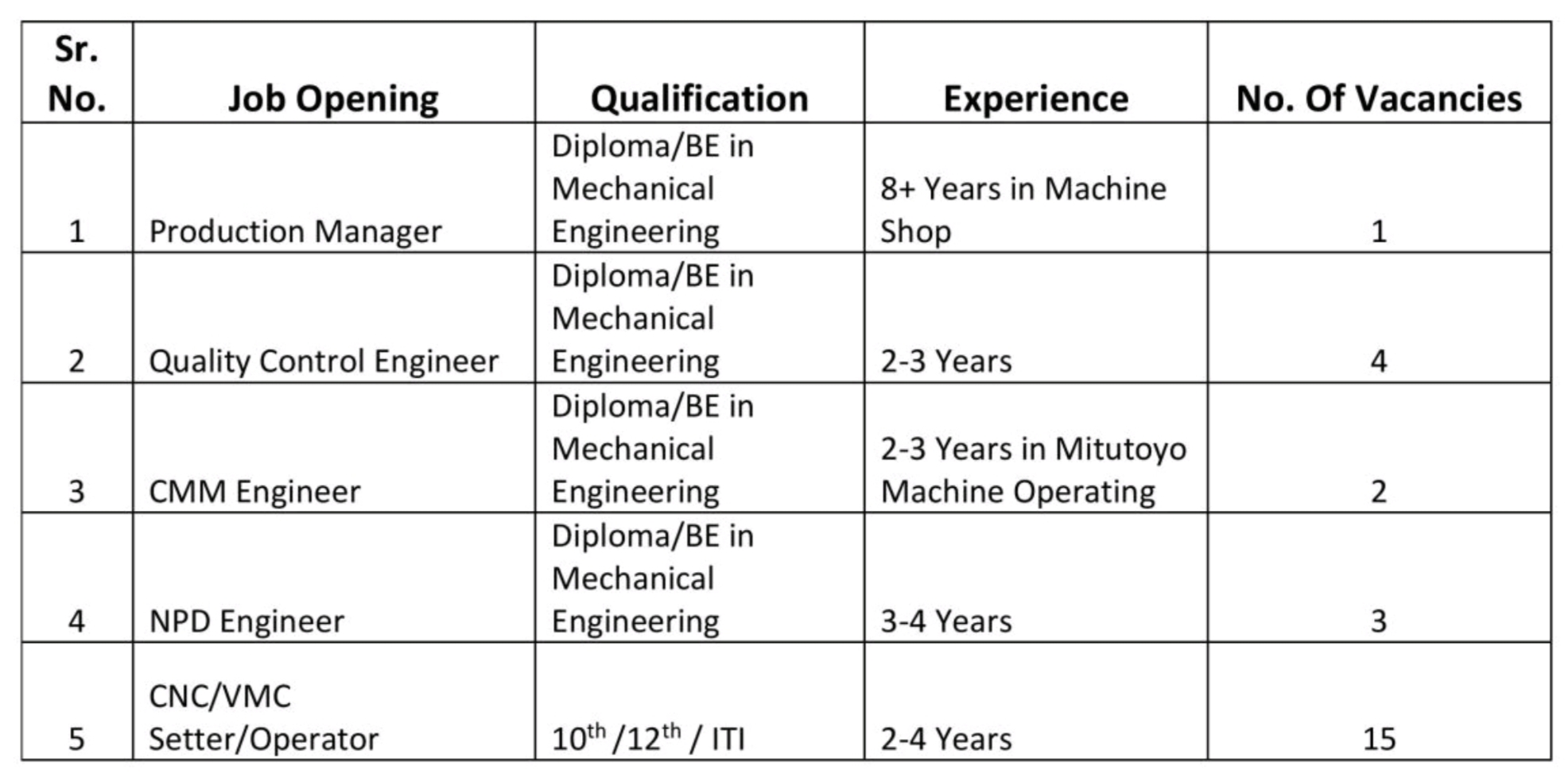 Positions :- CNC/VMC Operator, Quality Control Engineer & Others