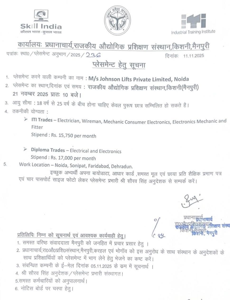- Venue: राजकीय औद्योगिक प्रशिक्षण संस्थान, किशनी (मैनपुरी)
