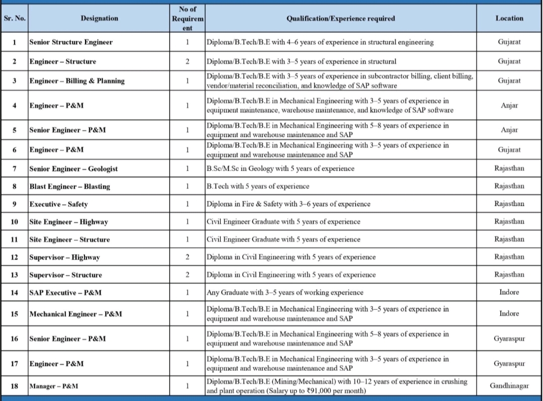 Positions :- Engineer, Sr. Engineer, Supervisor & Others