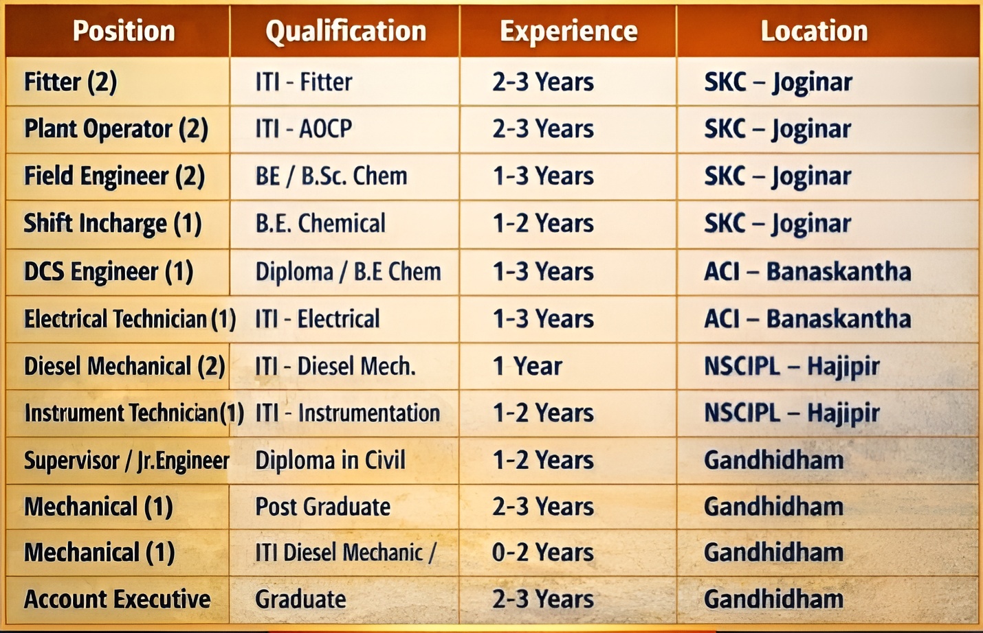 Positions :- Plant Operator, Shift Incharge, DCS Engineer & Others