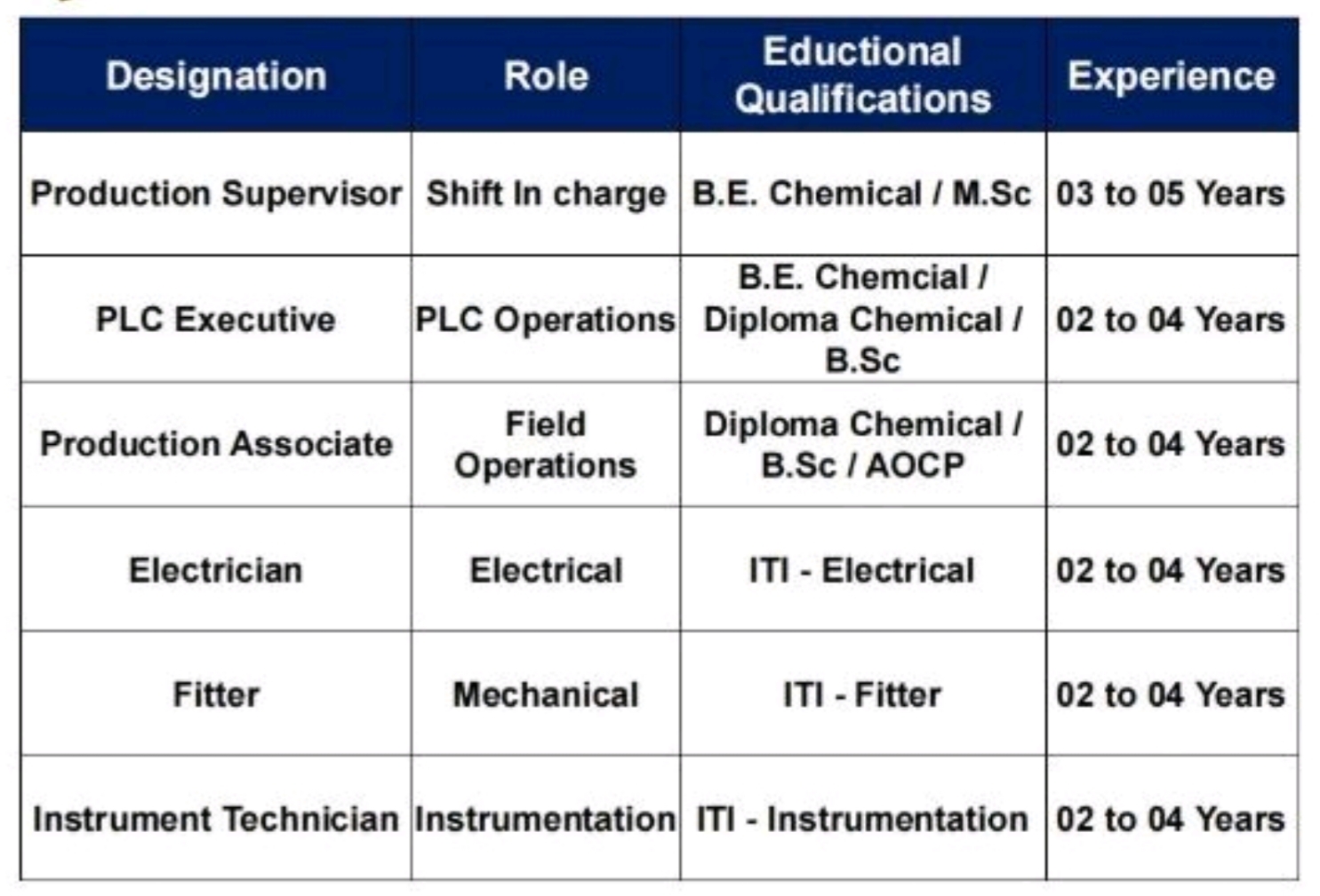 Positions :- Production Associate, PLC Executive Electrician, Fitter & Others