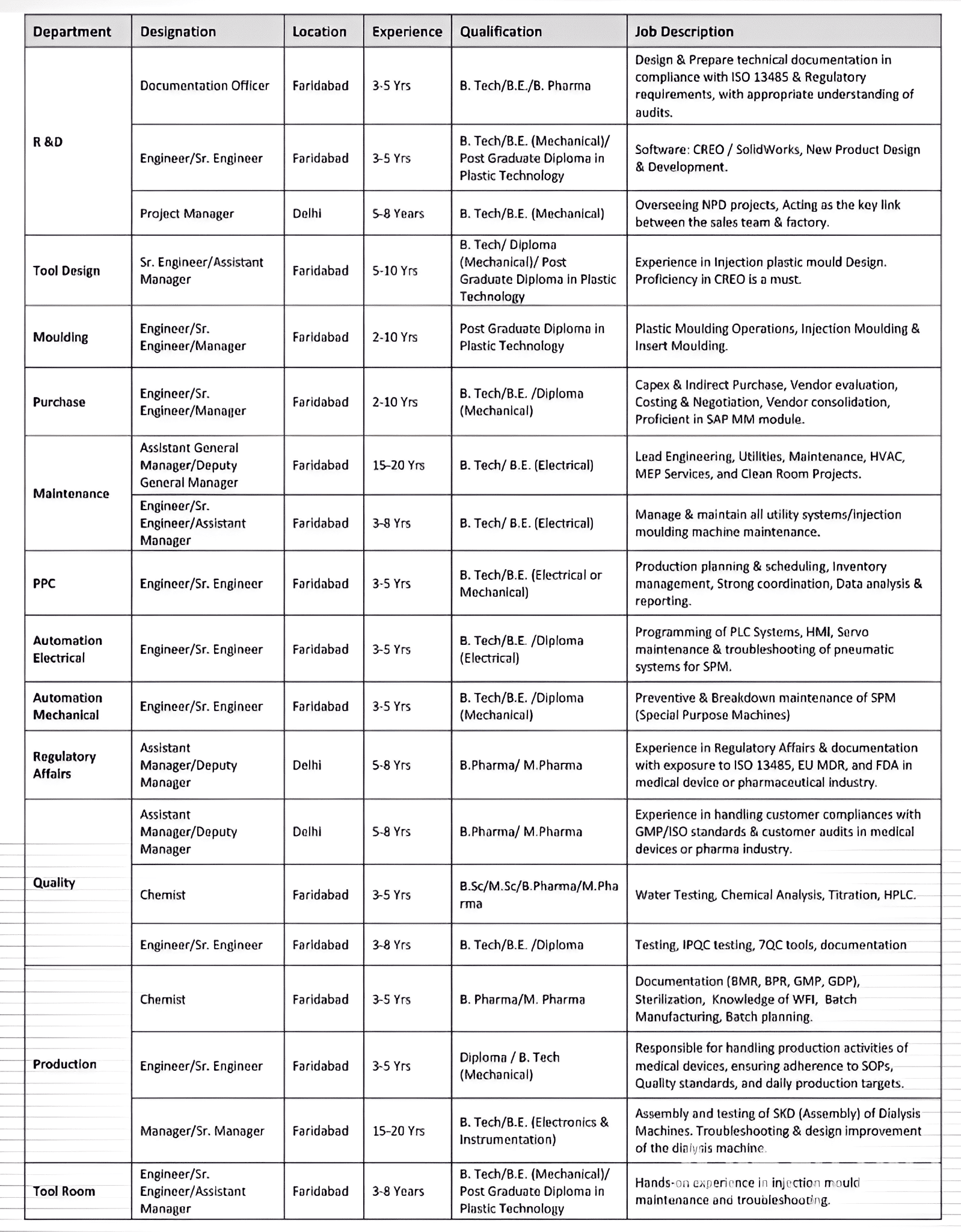 Positions :- Engineer, Sr. Engineer, Manager & Other