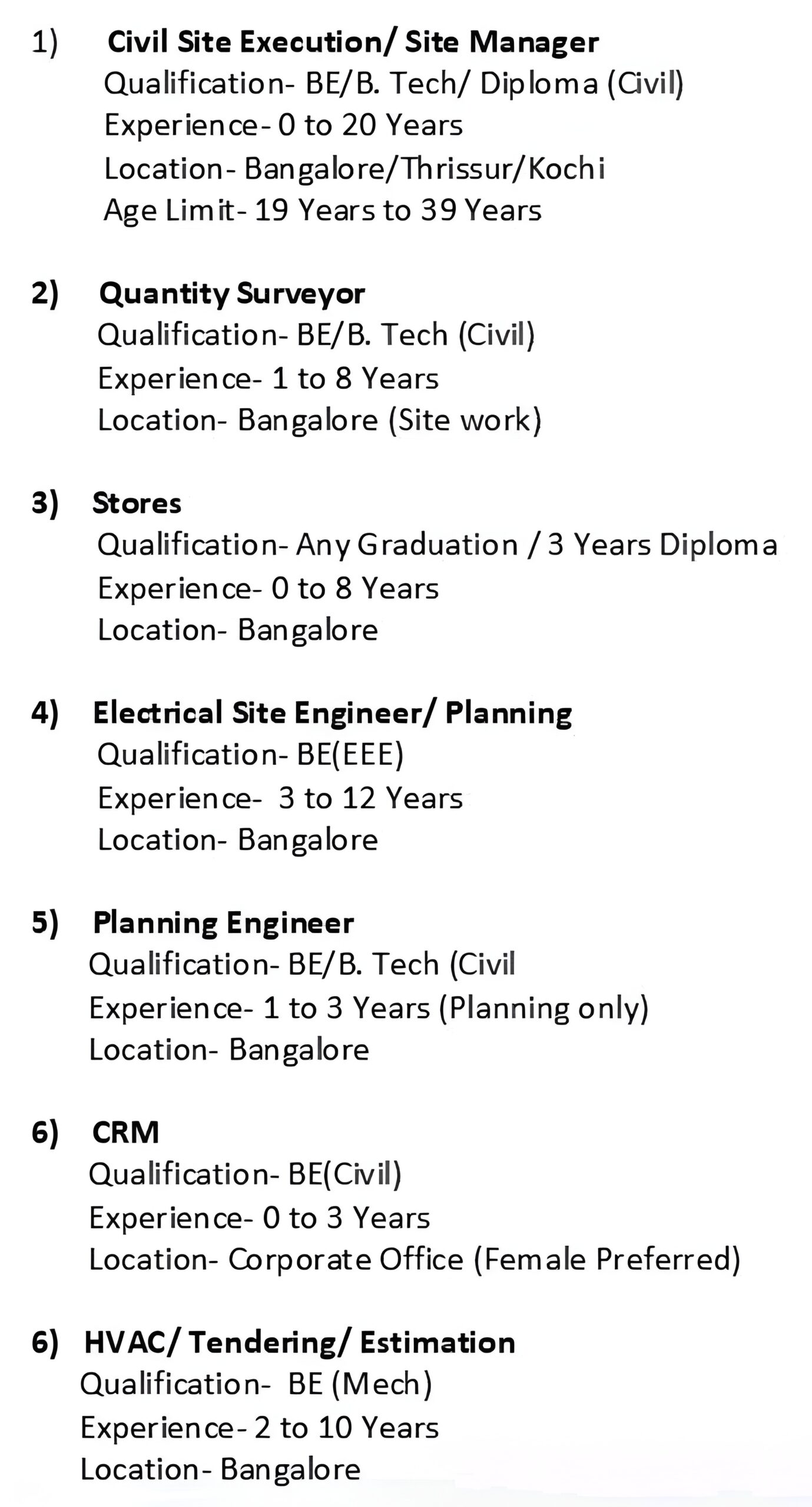 Positions :- Civil Site Execution, Electrical Site Engineer, Planning Engineer & Others