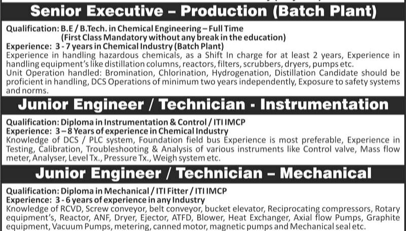 Positions :- Technician, Jr. Engineer, Senior Executive