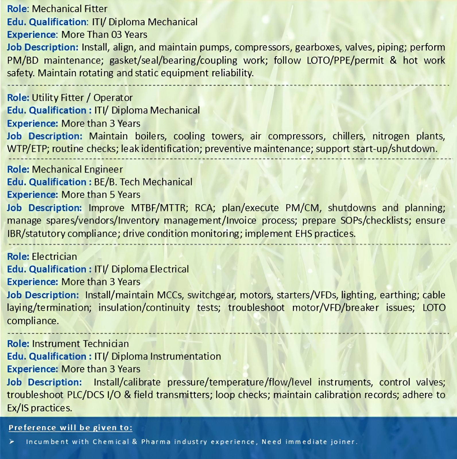 Positions :- Electrician, Utility Fitter, Operator & Others