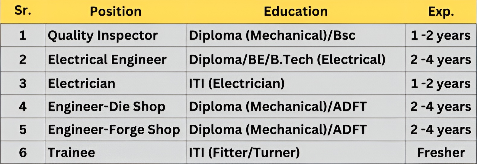 Positions :- Trainee, Quality Inspector, Electrical Engineer & Others